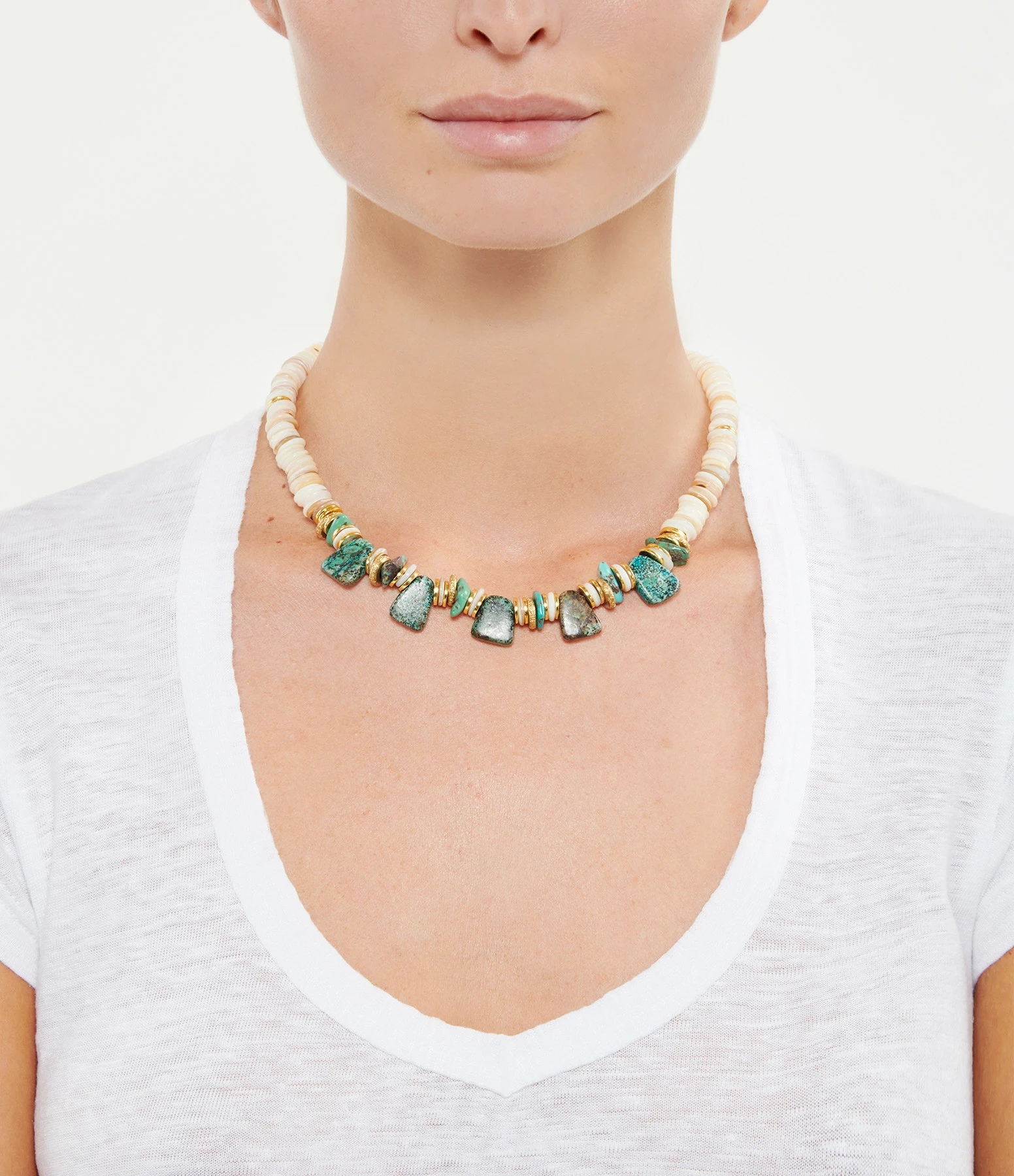 Collier en coquillages beiges avec pierres de turquoise. Fermoir classique à ressort avec chaînette de réglage.