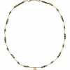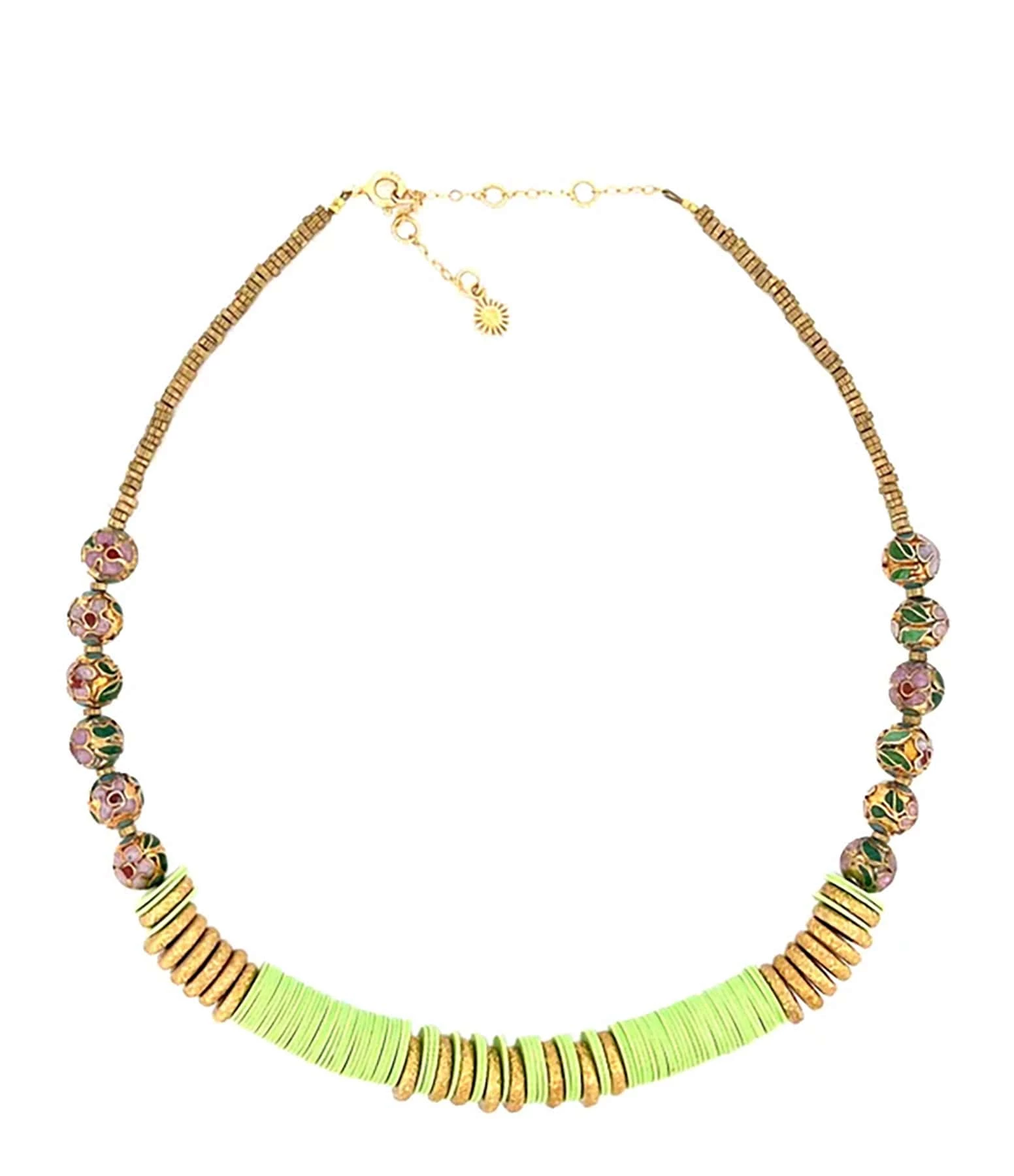 Collier en perles émaillées multicolores, vinyles verts et laiton doré. Fermoir classique à ressort avec chainette de réglage.