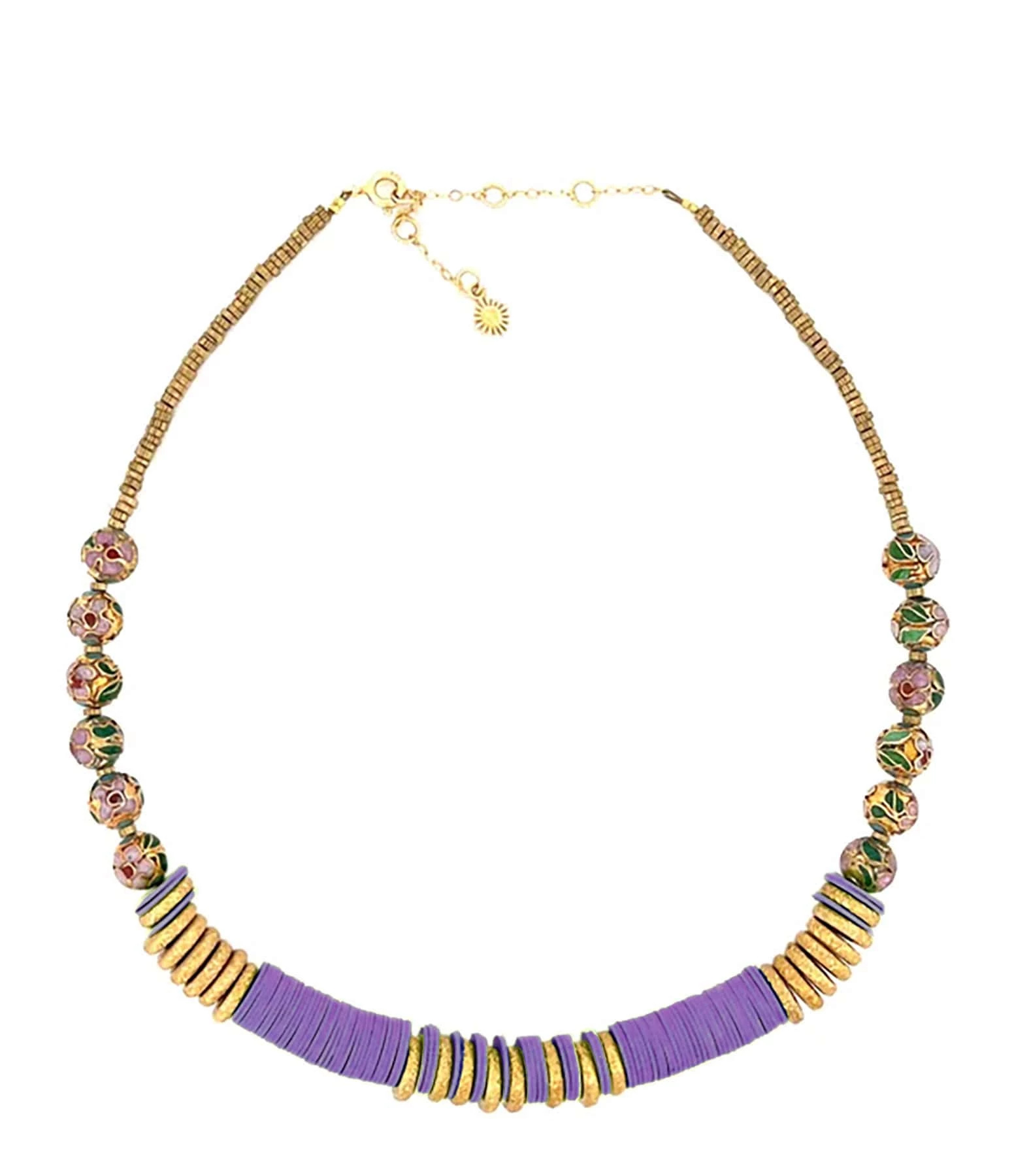 Collier en perles émaillées multicolores, vinyles violets et laiton doré. Fermoir classique à ressort avec chainette de réglage.
