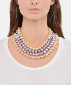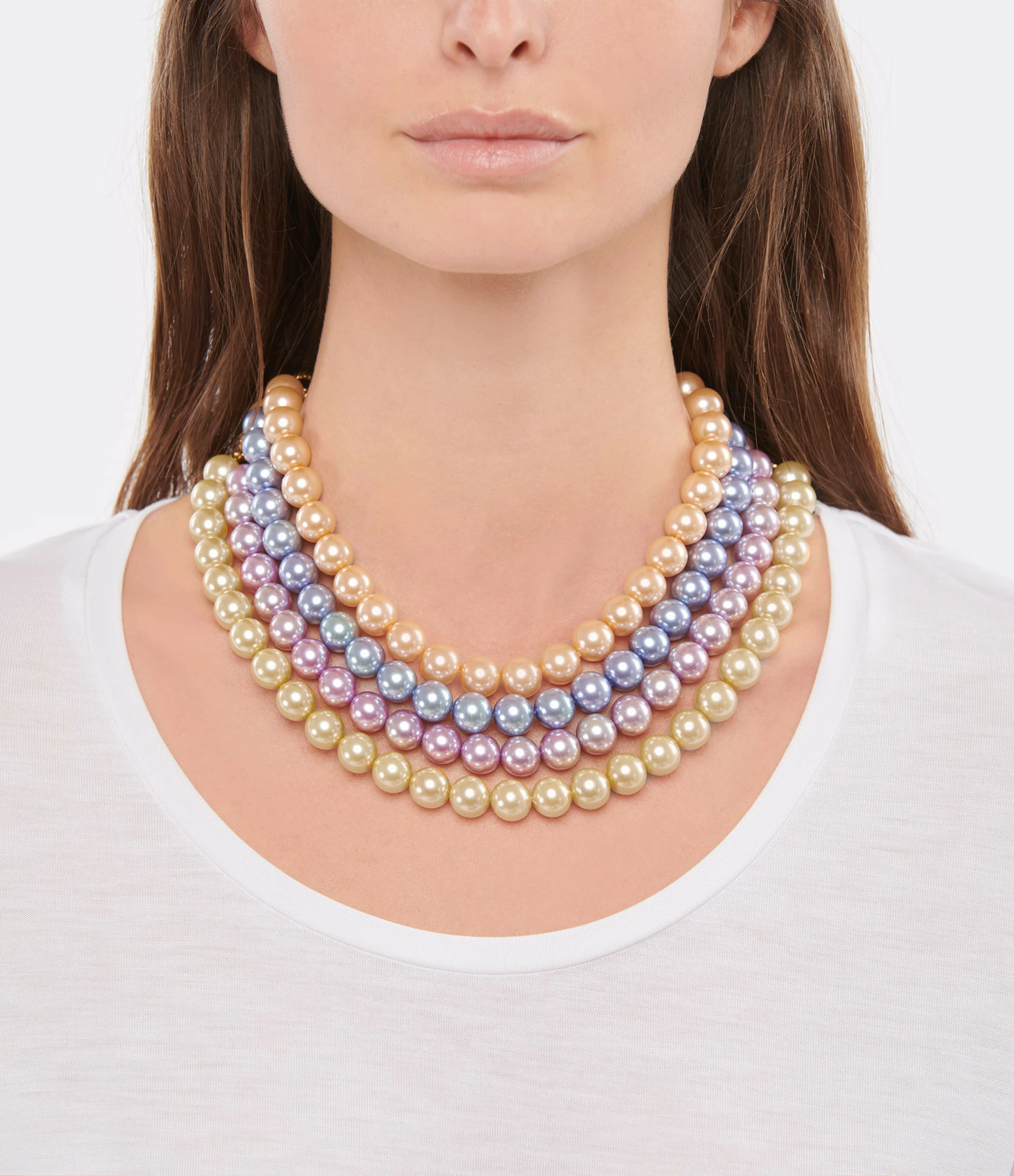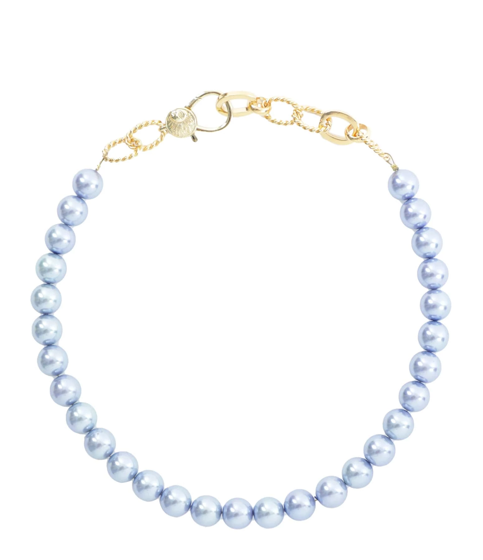 Collier en perles bleues nacrées sur chaîne en argent doré. Fermoir classique à ressorts.
