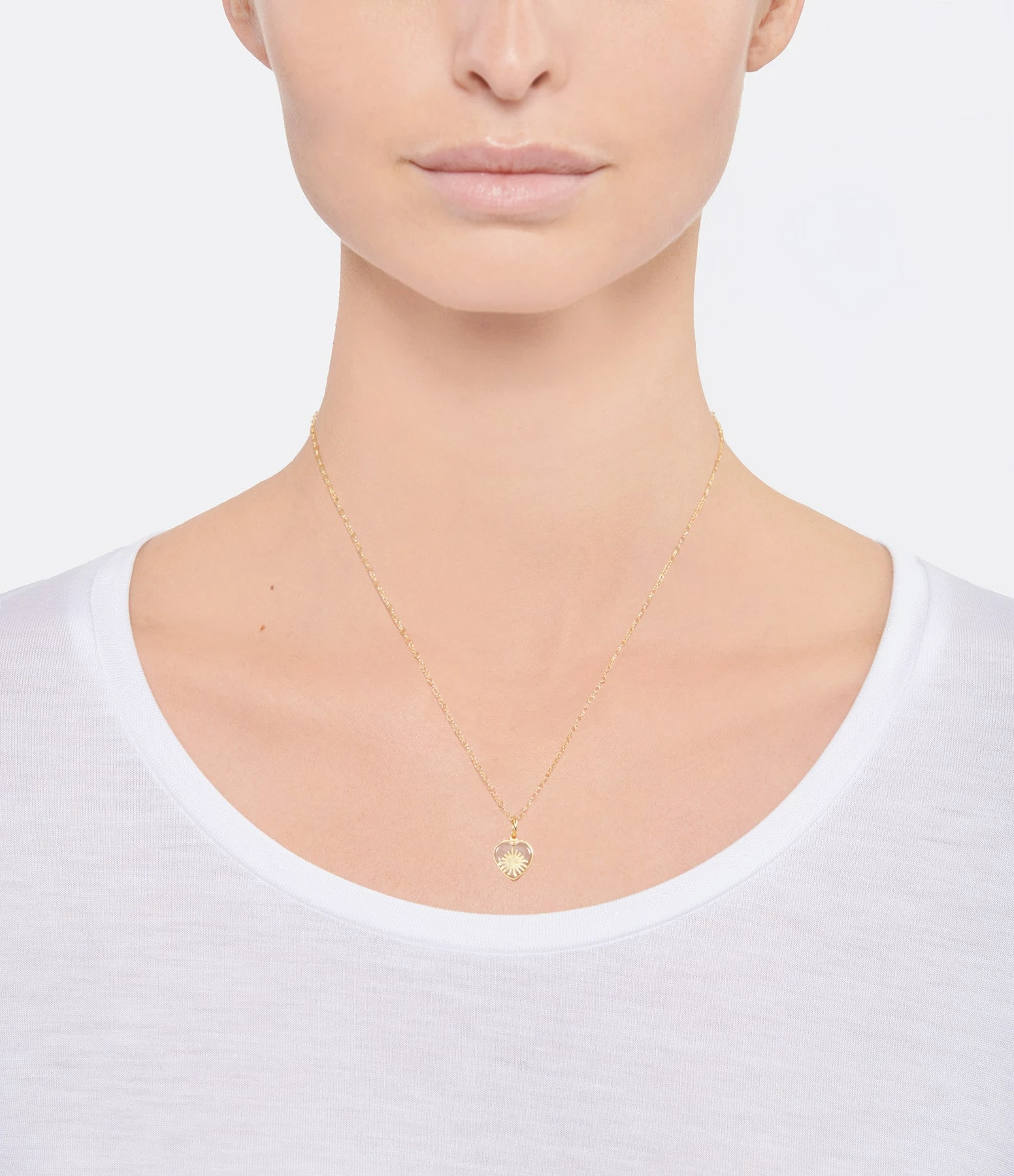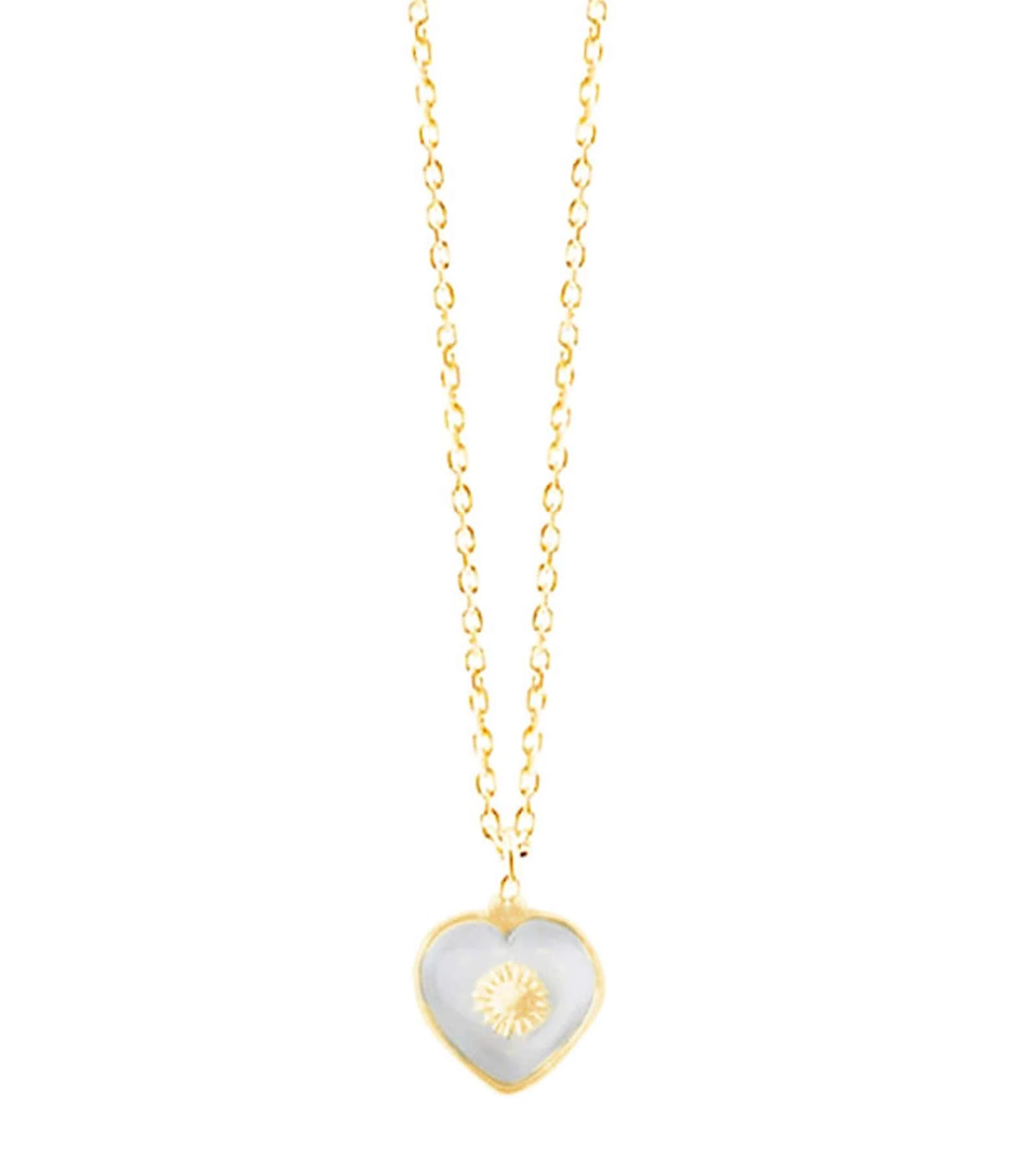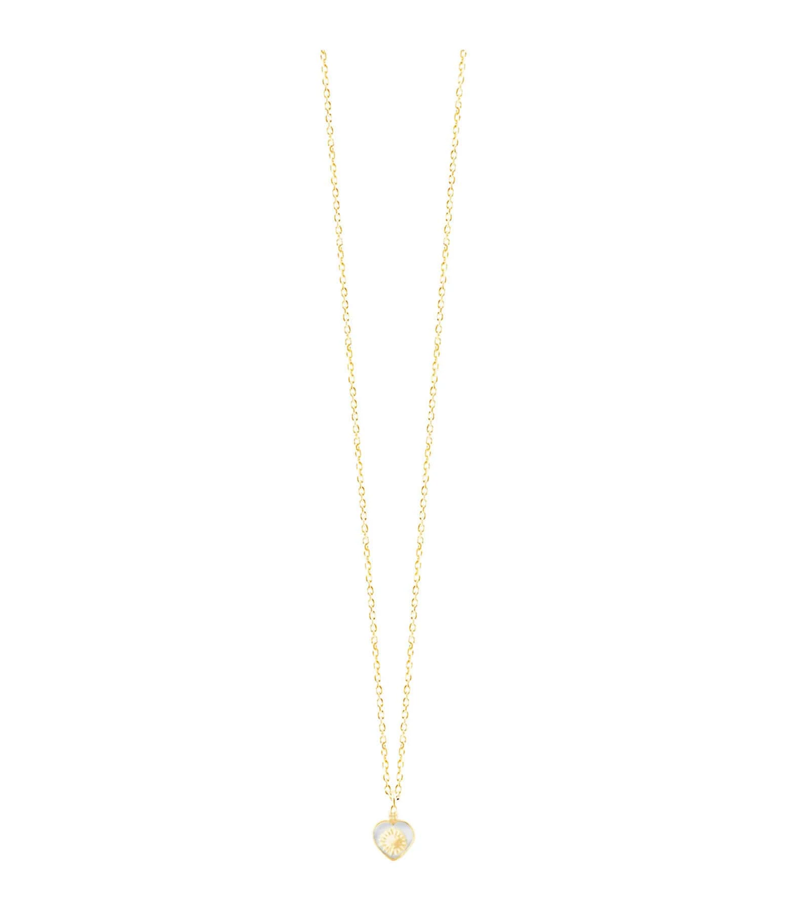 Collier sur chaîne en argent doré, pendentif cœur en cristal avec un soleil en argent doré au centre. Fermoir classique à ressort.
