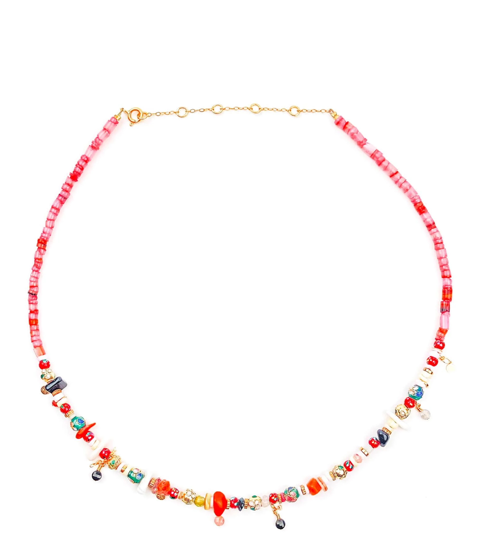 Collier avec différentes perles dans les tons roses. Fermoir classique à ressort avec chaînette de réglage.