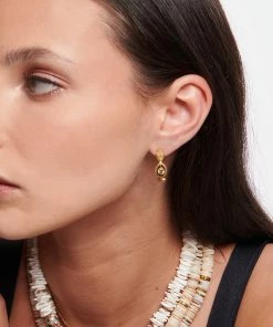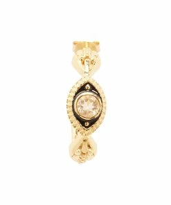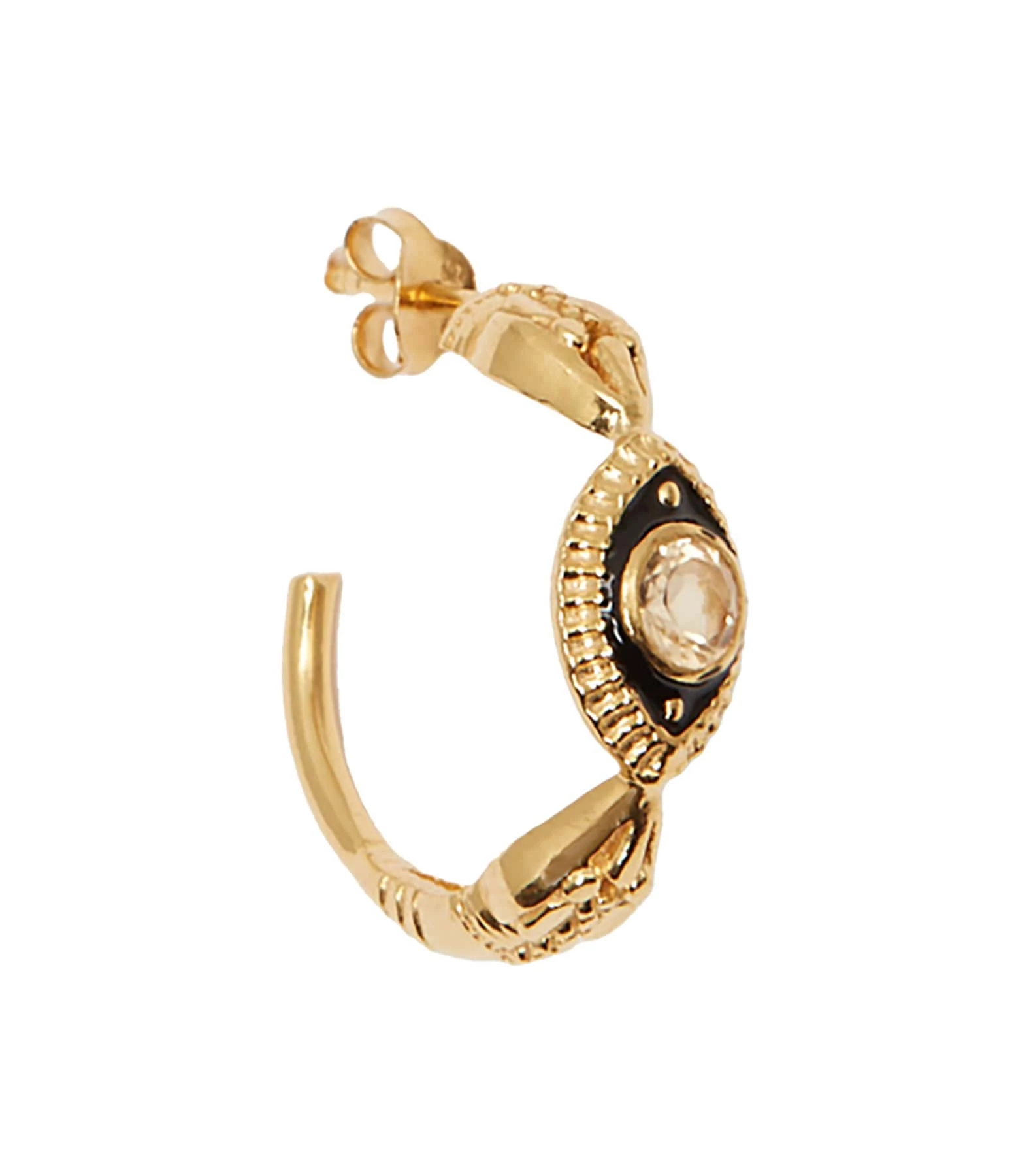 Créole en argent doré représentant un serpent et un œil avec une pierre de citrine à la place de la pupille. Fermoir poussette. Vendue à l’unité.