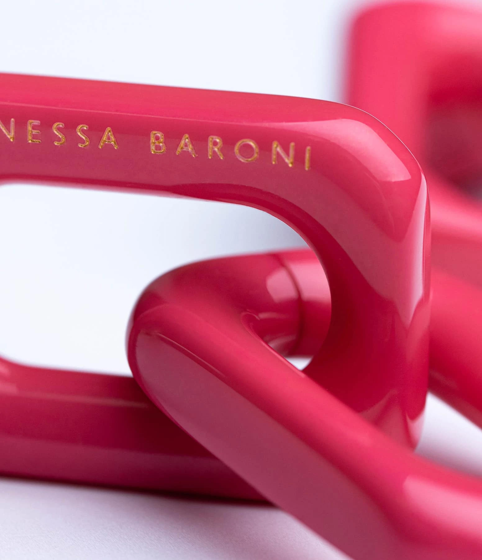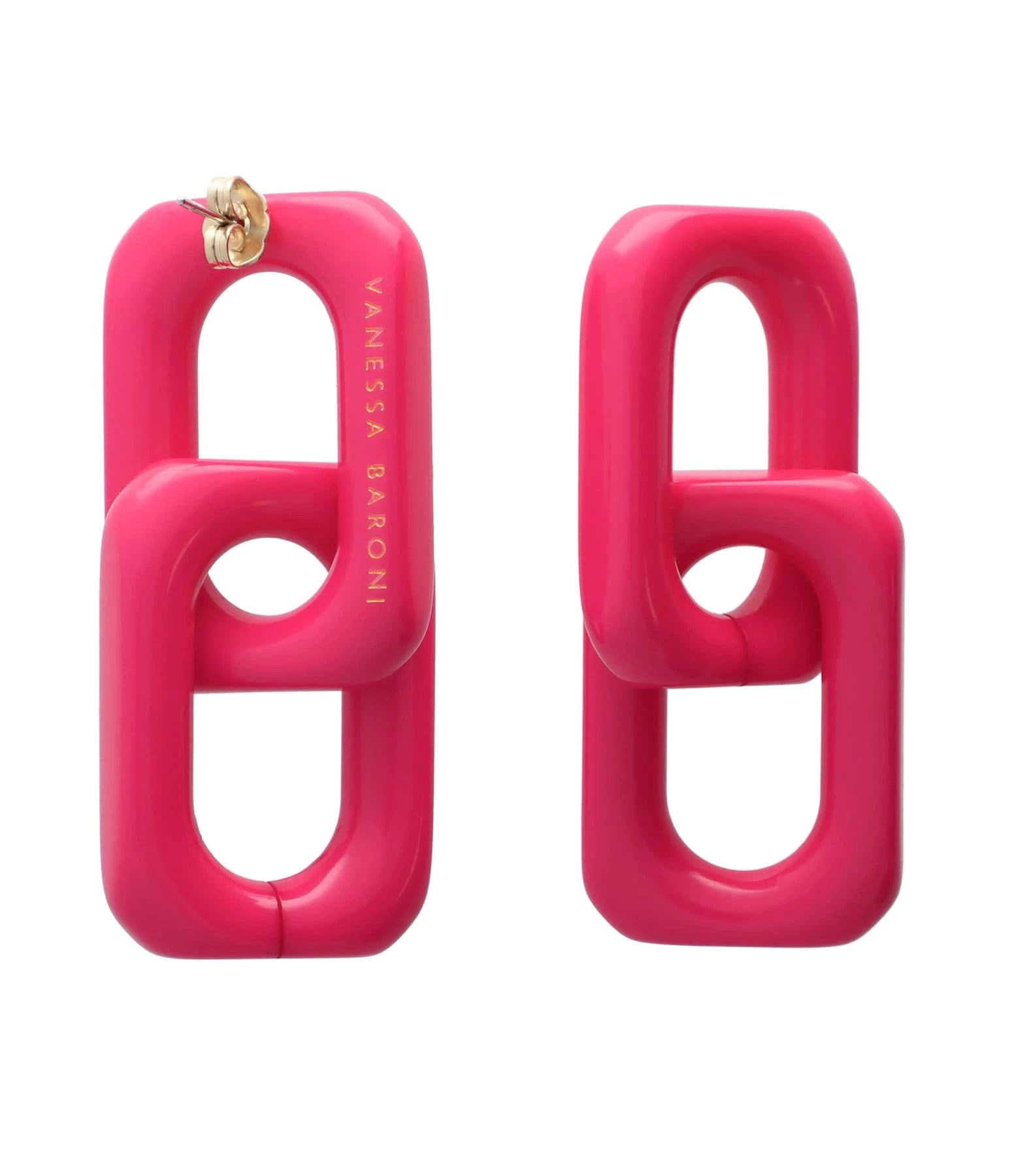 Boucles d’oreilles roses à double maillons rectangulaires. Fermoir poussette.