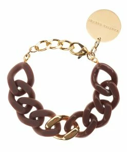 Bracelet à maillons plats marrons brillants, doré et marrons mats. Fermoir à ressort.