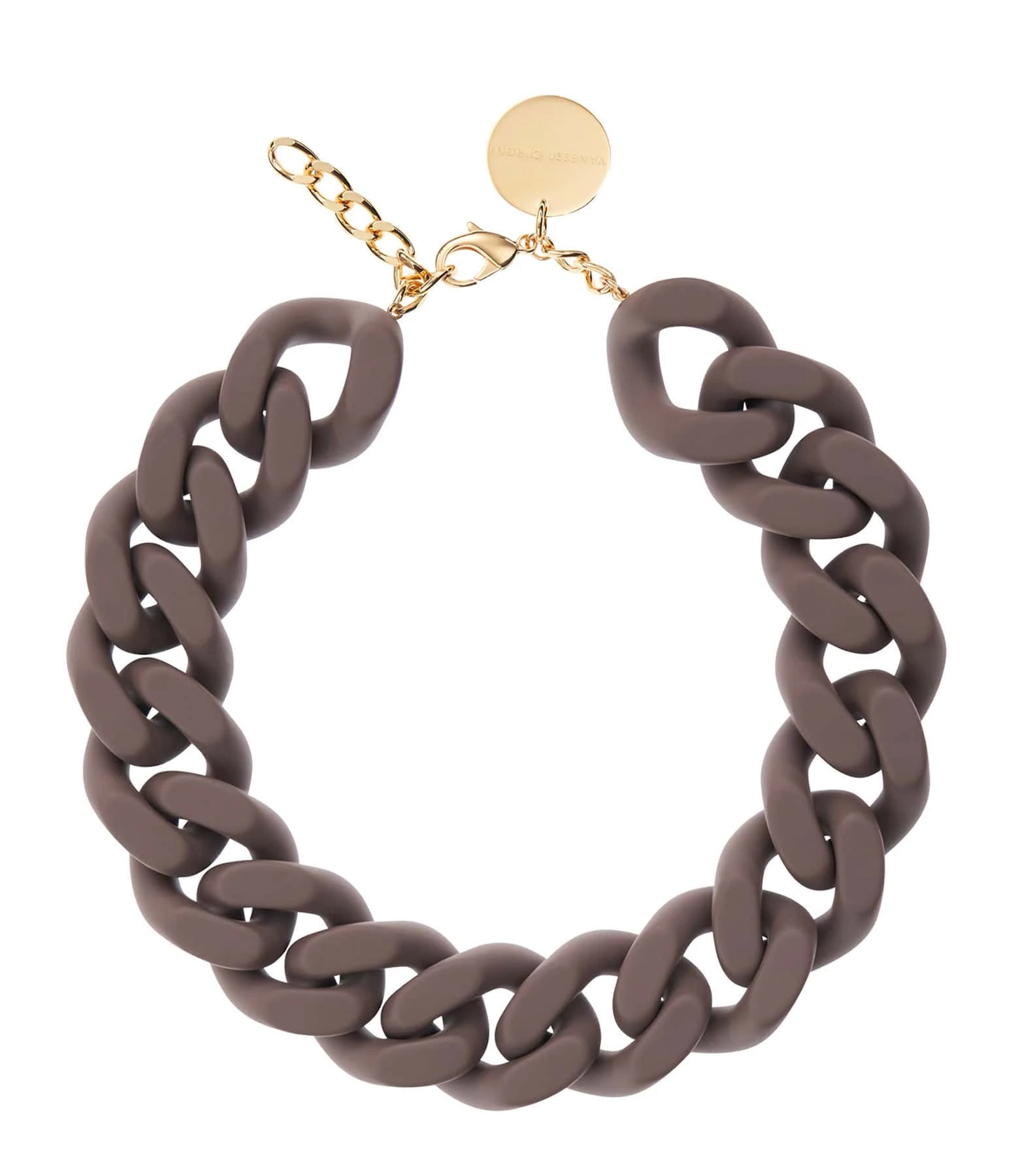 Collier marron taupe mat à gros maillons plats. Fermoir classique à mousqueton.