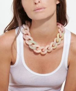 Collier jaune à gros maillons multicolores. Fermoir classique à ressort.