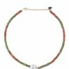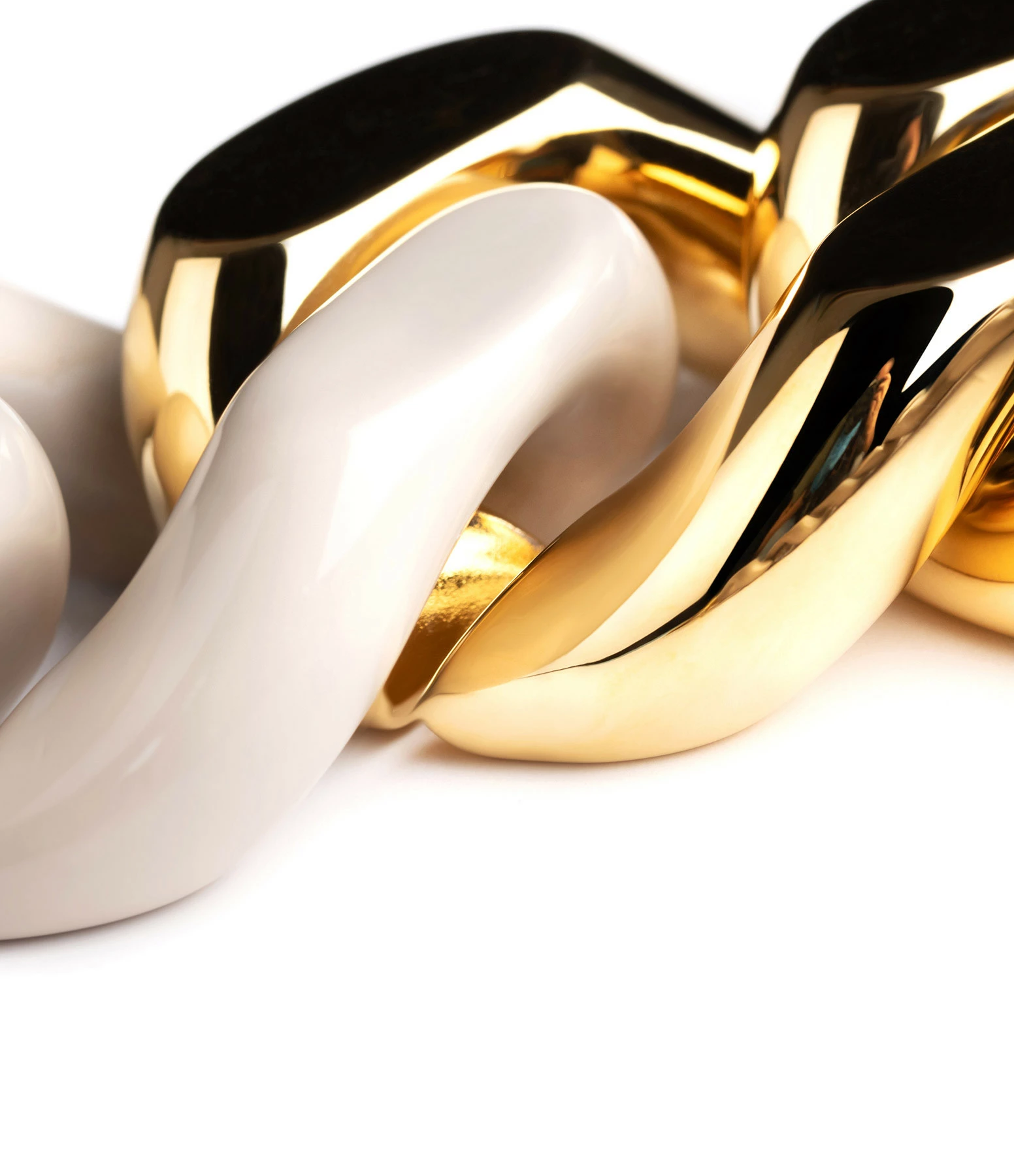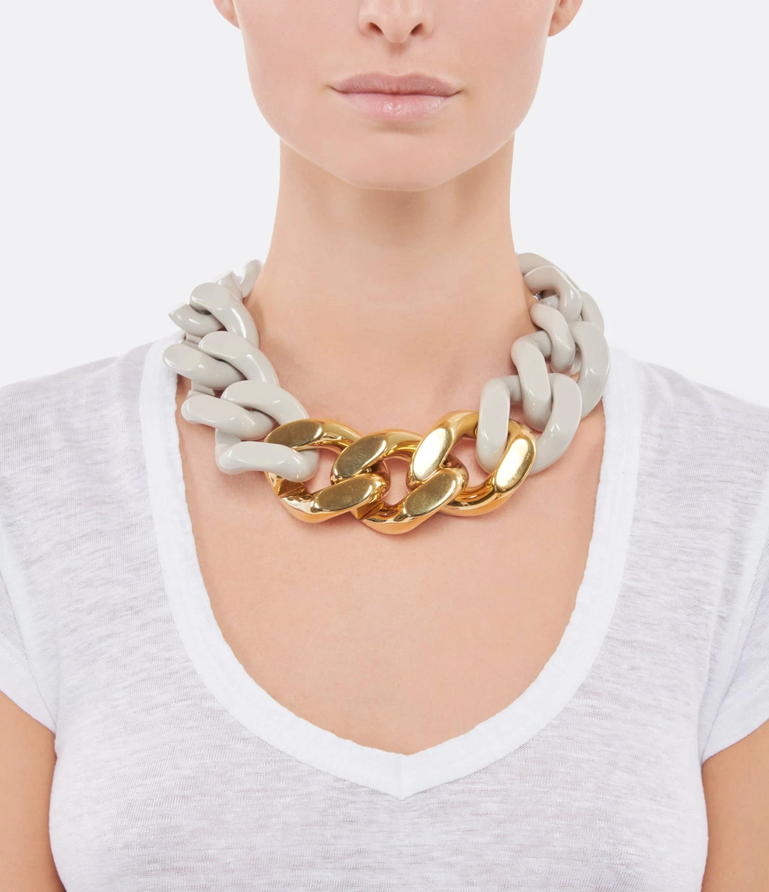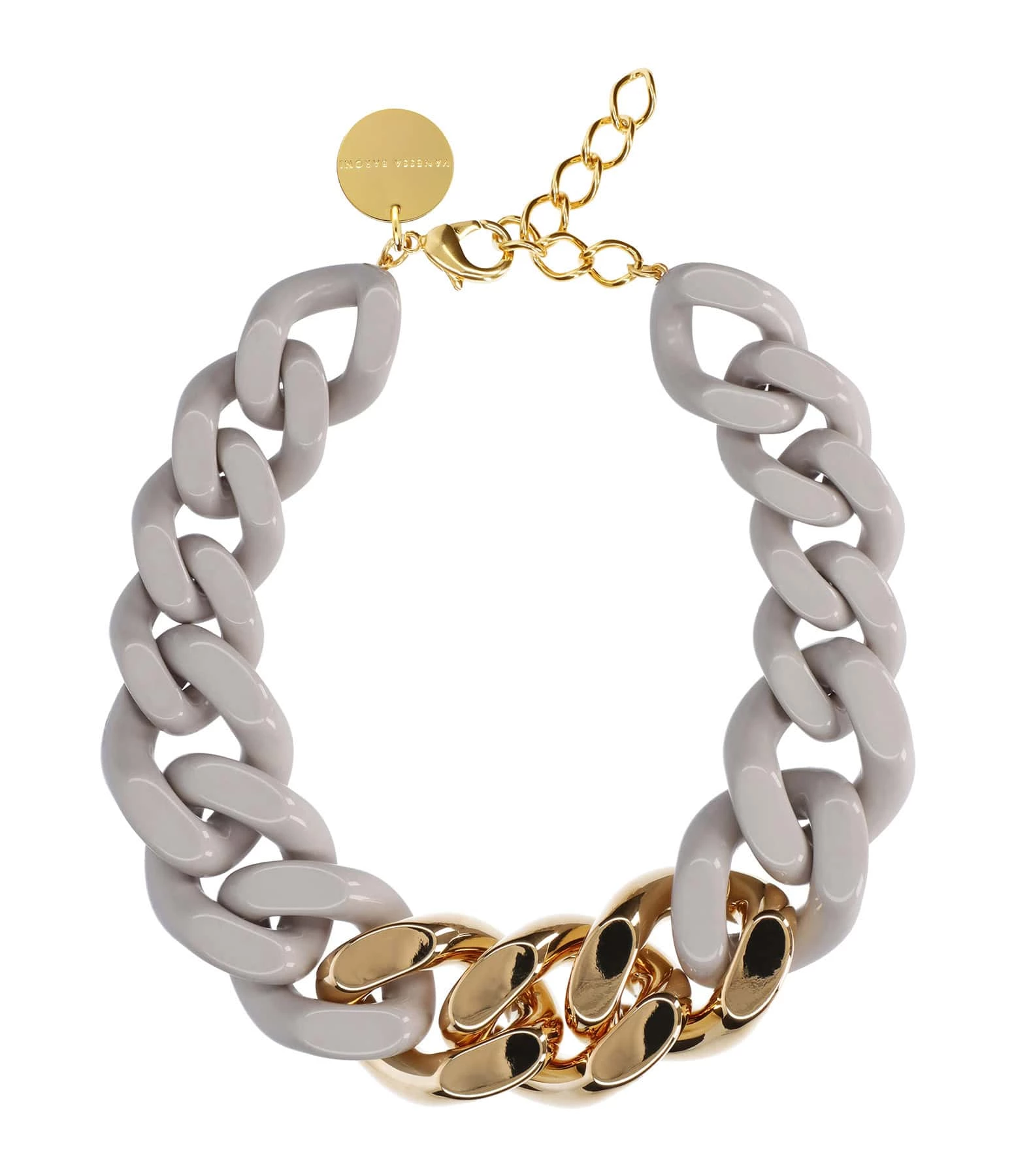 Collier à gros maillons gris, trois maillons dorés. Fermoir classique à ressort.