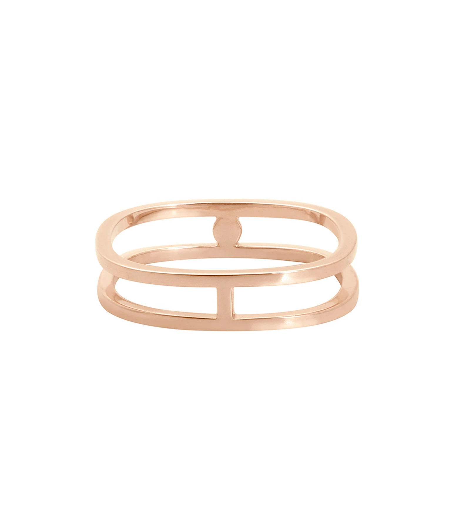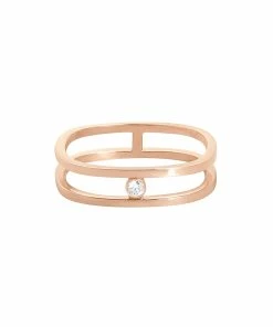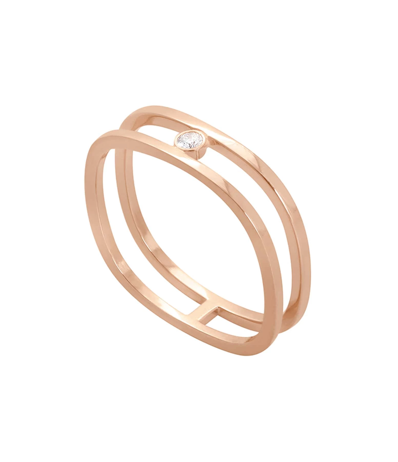 Bague carrée double anneau en or rose agrémentée d’un diamant serti.