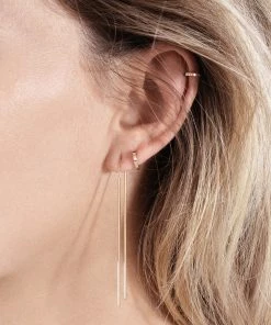 Boucle d’oreille sur chaîne en or rose, deux barrettes agrémentées d’une chaînette centrale.
