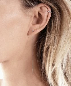Boucle d’oreille longue en or blanc sertie d’un diamant blanc. Système sans fermoir, chaînette à glisser dans le piercing.