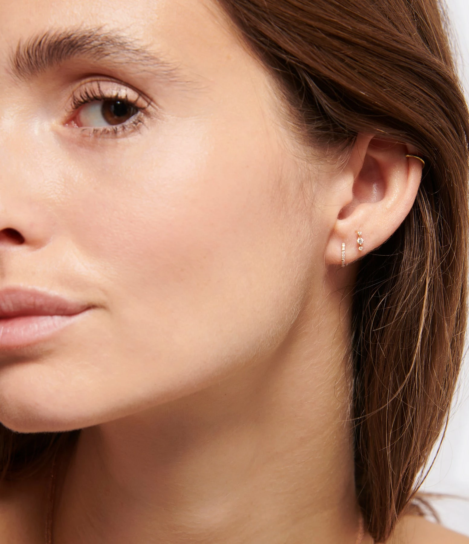 Puce d’oreille en or rose ornée de trois diamants sertis à la main. Fermoir sécurisé Alpa. Vendue à l’unité.