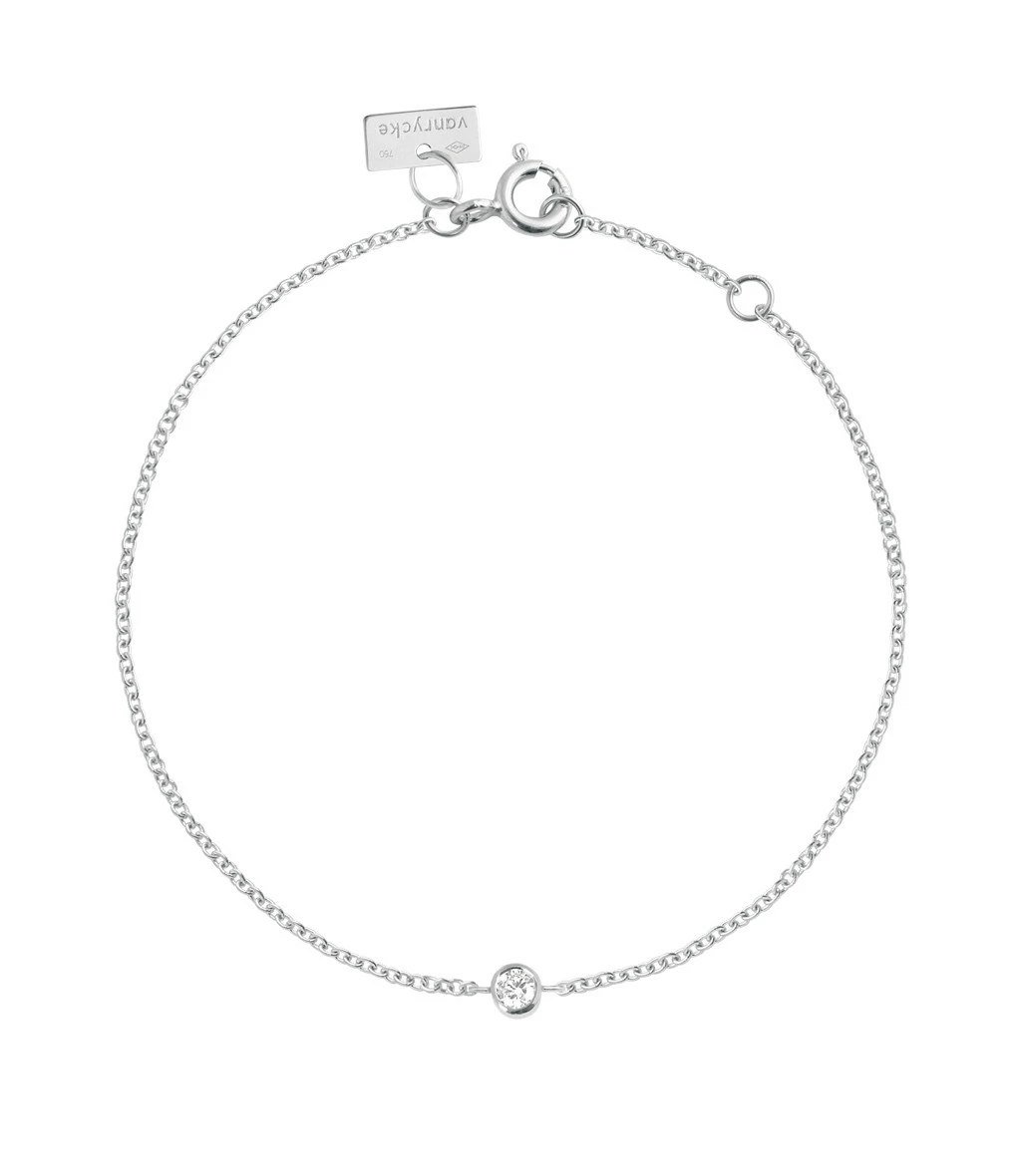 Bracelet sur chaîne en or blanc serti d’un diamant blanc. Fermoir classique.