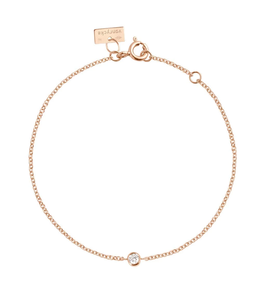 Bracelet sur chaîne en or rose serti d’un diamant blanc. Fermoir classique. Taille ajustable par contre-anneaux.
